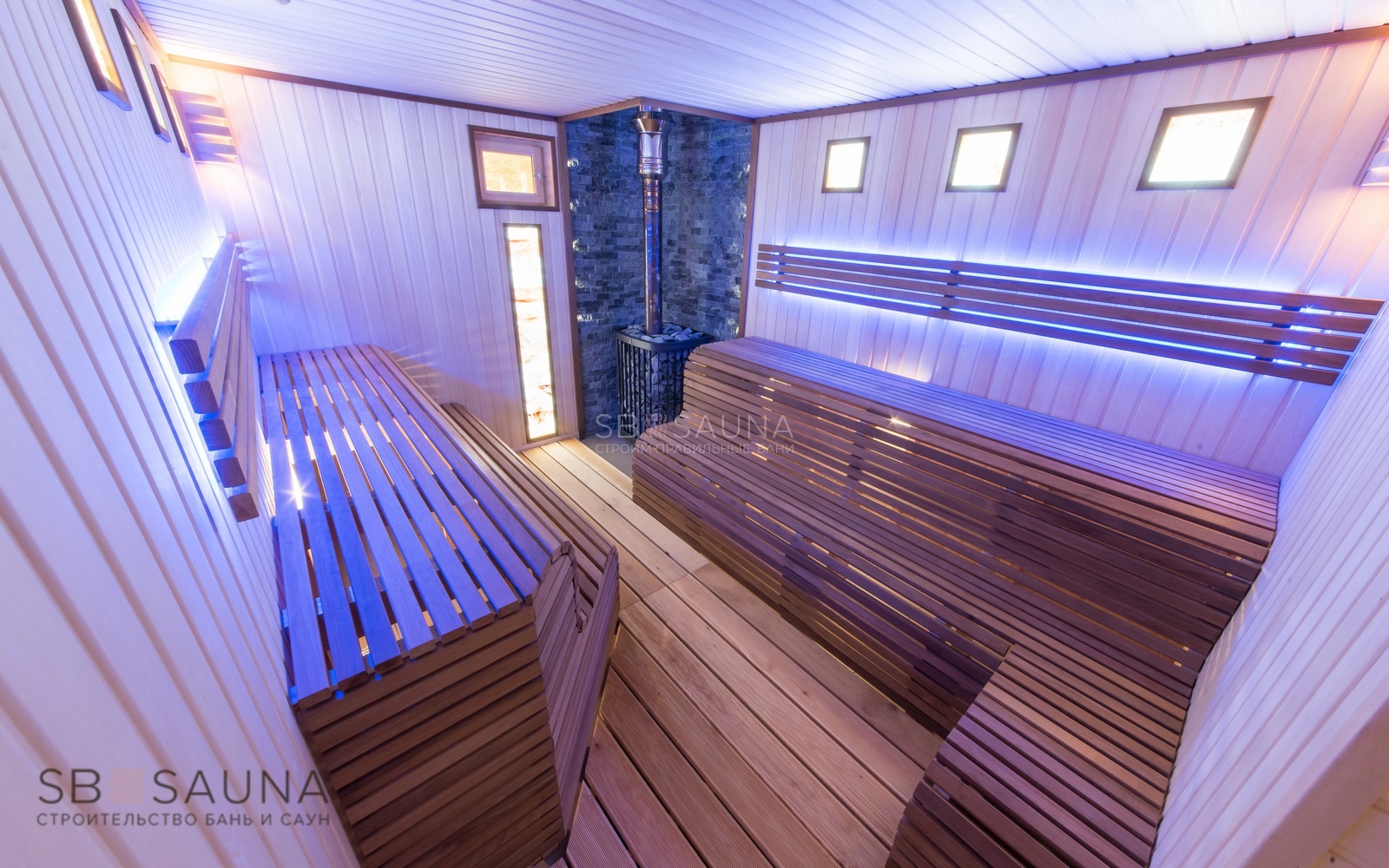 Обратите внимание на уникальность использования палатьев анатомического типа при строительстве данной финской сауны. Завершающим акцентом стало использование светодиодной подсветки и оптоволокна Cariitti.